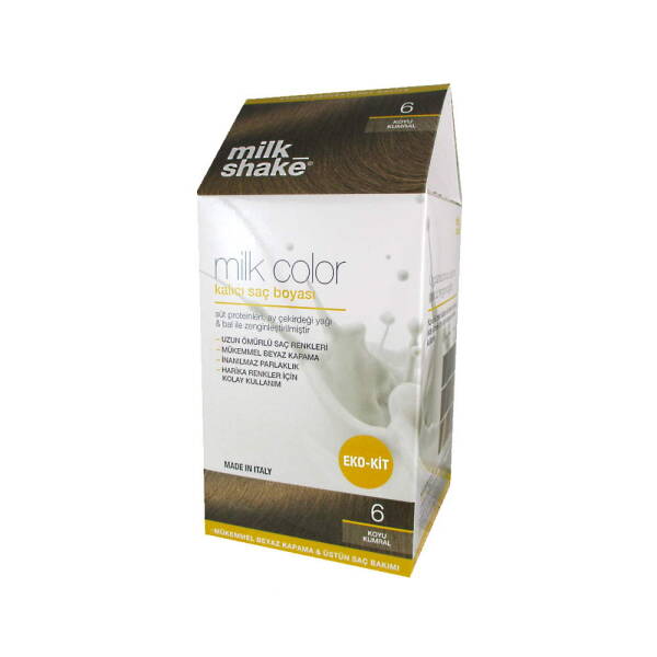 Milk Shake 6 Dark Brown Hair Dye 6 Dark Brown is easy to use. It helps you get long-lasting and shiny hair color and cover your gray hair. Set Content: 1 home application guide, 1 milk color 40ml, 1 developer emulsion 60ml, 1 pair of gloves, 1 color maintainer shampoo, 10ml, 1 color maintainer conditioner 10ml, Product Content: aqua(water), cetearyl alcohol, propylene glycol, cetearet-25, cocamide mea, ammonium hydroxide, stearic acid, palmitic acid, myrisyl alcohol, polyquaternium-22, sodium hydrosulfite, sodium sulfite, ethanolamine, ascorbic acid, m-aminophenol, 1-naphtol, p-phenylenediamine, p-aminophenol, 4-chlororesorcinol, 1-naphtol, 2-methylresorcinol, 2-amino-4-hydroxyethylaminoanisole sulfate, resorcinol, tetrasodium edta, helianthus annus (sunflower) seed oil, mel(honey), mangifera indica (mango) fruit extract, rubus idaeus ( raspberry) fruit extract, citrus nobilis (mandarine orange) peel extract, hydrolyzed milk protein, trideceth-12, peg-3 distearate, peg-8, sodium lauroyl lactylate, hydrolyzed wheat protein, methicone, polyquaternium-10, carbocysteine, sodium dehydroacetate, phenoxyethanol, methylparaben, ethylparaben, propylparaben, parfum(fragrance)
