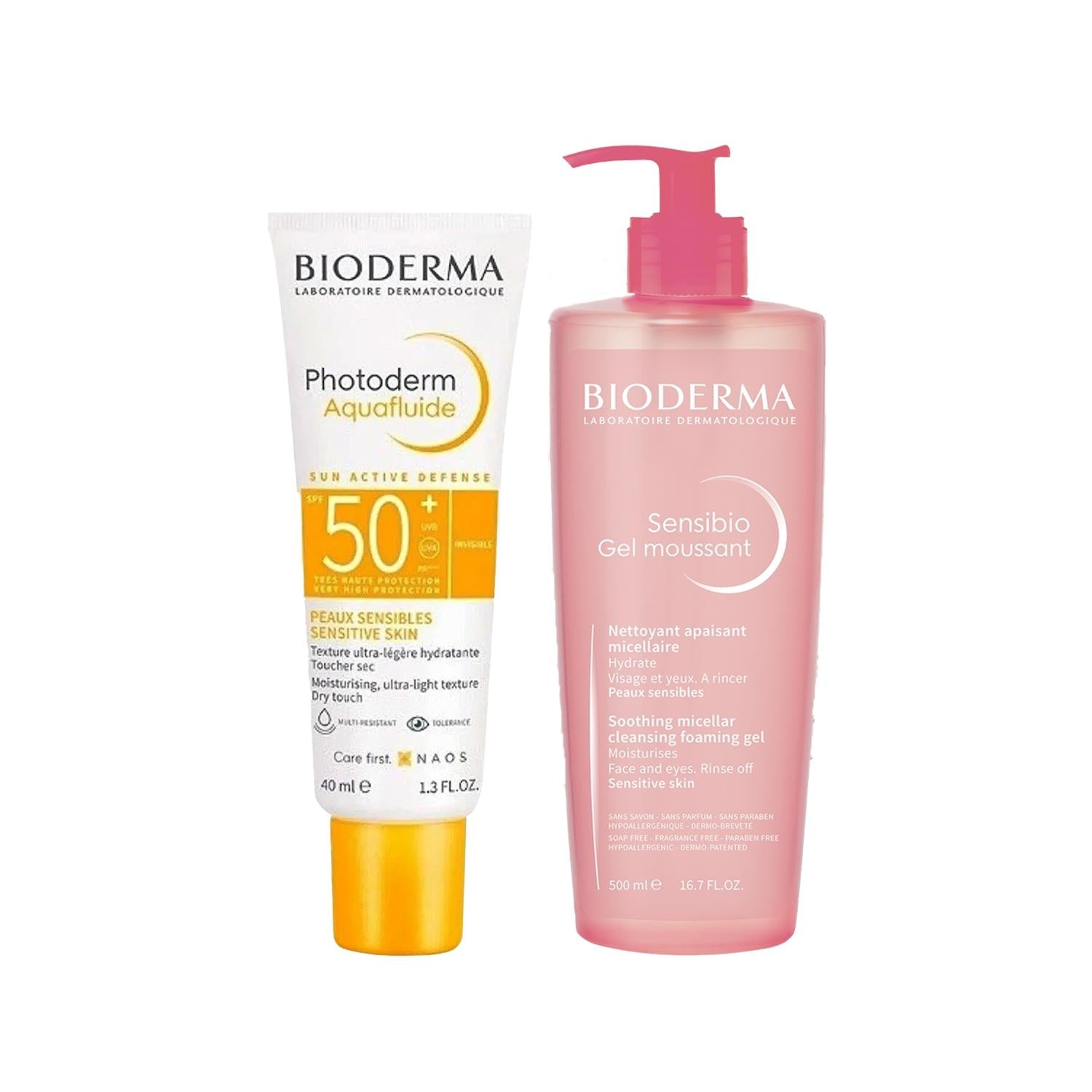 Bioderma Skincare Set - Sensibio Cleansing Gel 500ml & Photoderm Aquafluid Sun Cream 40ml for Sensitive Skin