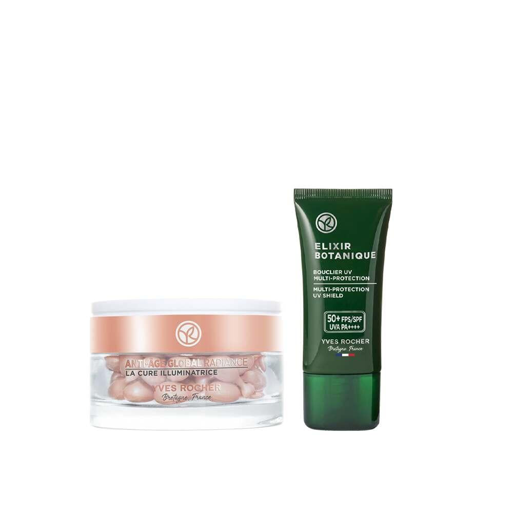 This powerful set includes two key products: the Anti-Age Global treatment with plant stem cells and the 50+ SPF face cream with anti-oxidant properties. Together, they work synergistically to brighten and revitalize your skin's appearance, combat signs of aging, and provide high sun protection against UVA/UVB rays.