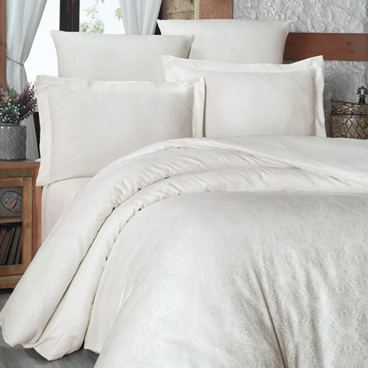 Transform your bedroom with the luxurious Maxstyle Jacquard Satin Duvet Set in a sleek cream color. This elegant set combines style with quality, making it a perfect addition to any modern decor.